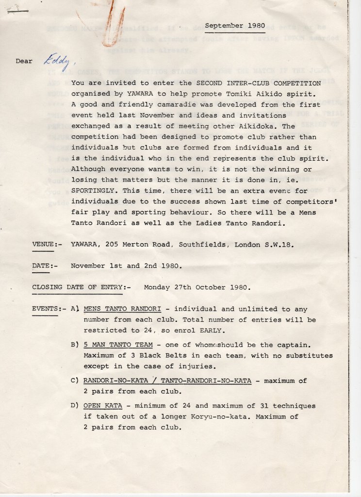 In 1980 nam Shobukai Aikido Club voor het eerst deel aan een Tomiki Aikido-wedstrijd. Omdat de club geen ervaring had met deze competitievorm, was het niet verwonderlijk dat er geen overwinningen werden behaald. De andere deelnemende clubs beschikten immers over jarenlange ervaring in het competitieve aspect van Aikido. Desondanks bood deze eerste deelname waardevolle inzichten om deze weg verder te verkennen.